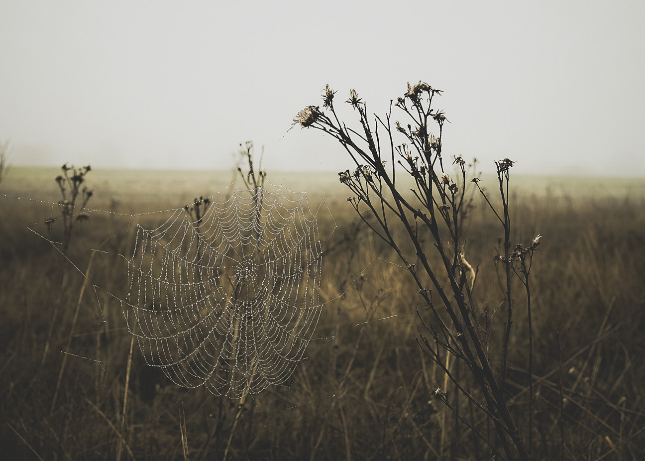 Spider Web on Foggy Morning in Spring