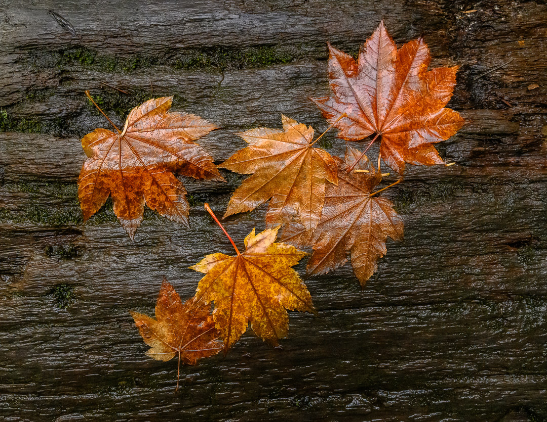 Maple Leaves on Wet Log
